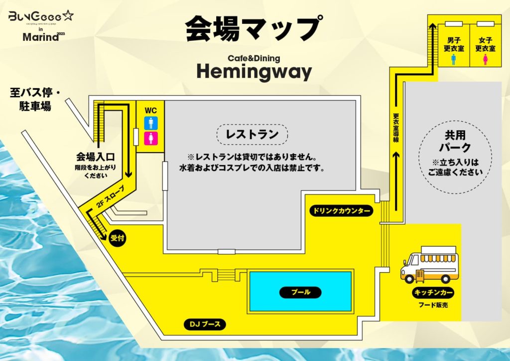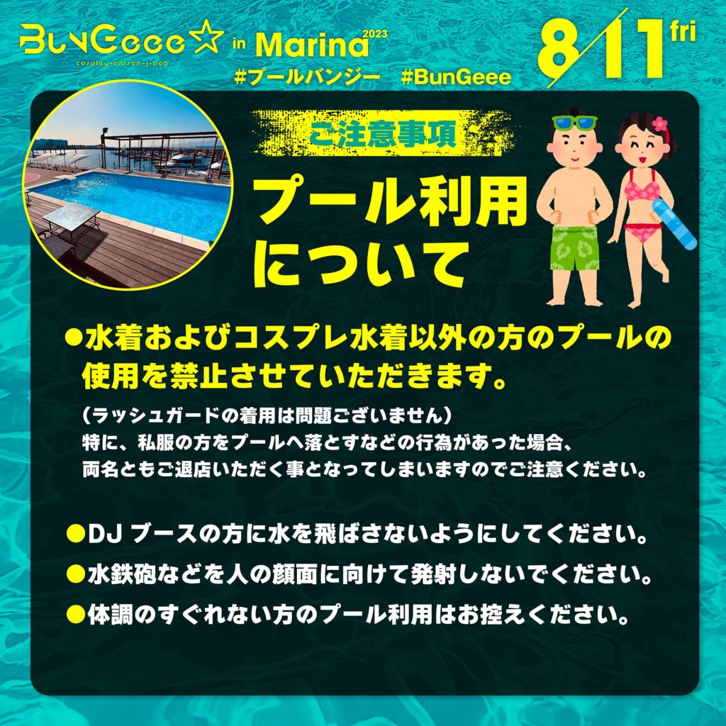 - 水着およびコスプレ水着以外の方のプールの使用を禁止させていただきます。(ラッシュガードの着用は問題ございません)