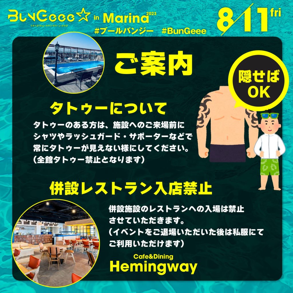 タトゥーのある方は、ご入館前にシャツやラッシュガード・サポーターなどでタトゥーが見えない様にしてご入館ください。また、イベント中は常にタトゥーを隠してください。(全館タトゥー禁止となります)